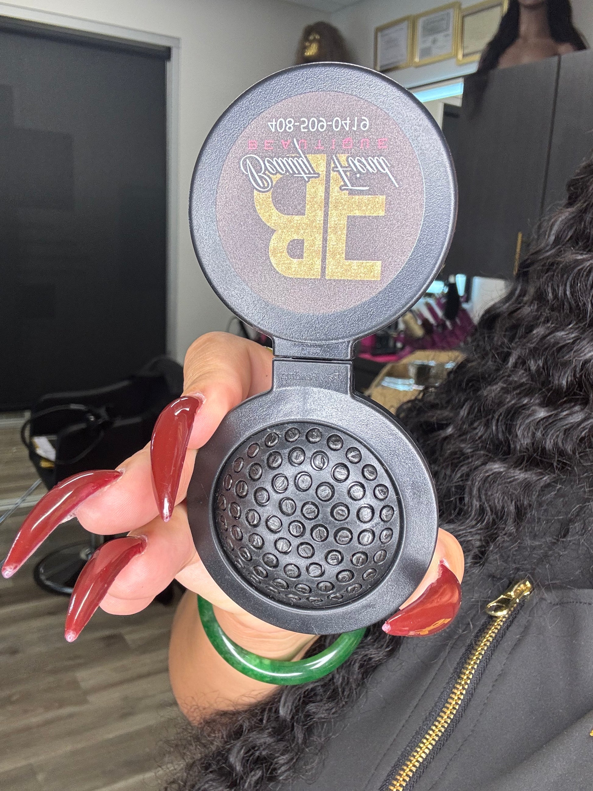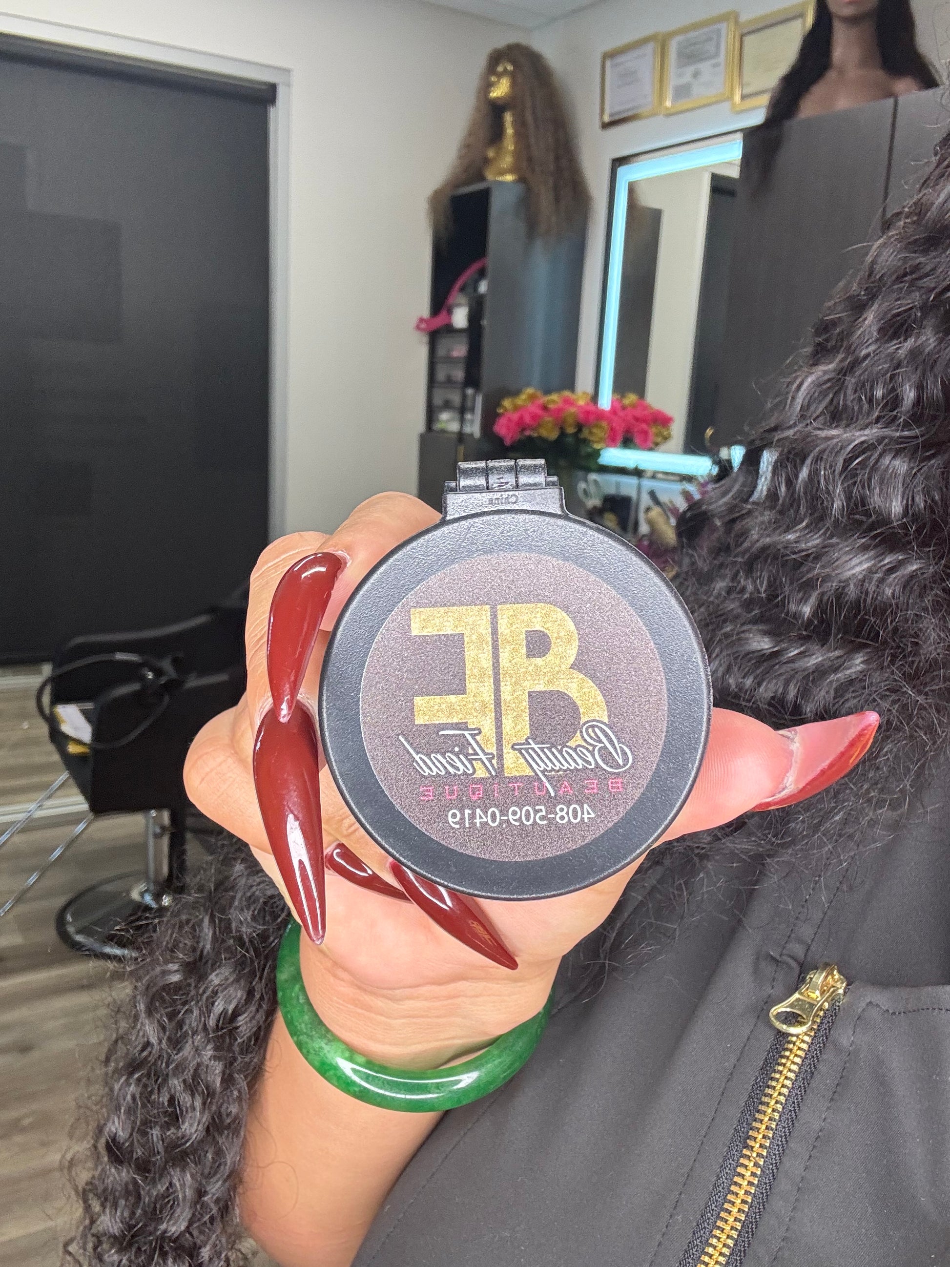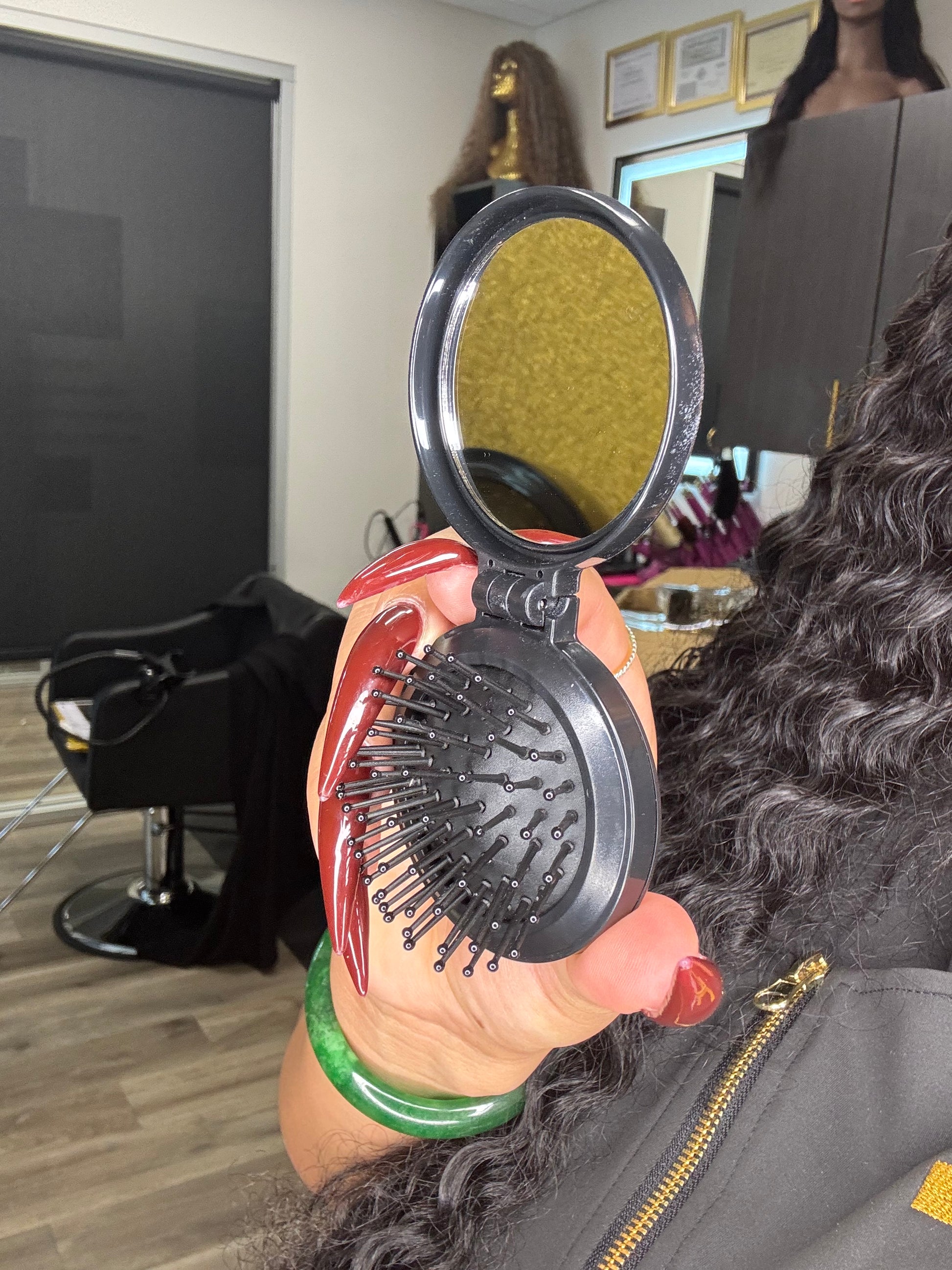 This mini paddle brush/mirror combo. Perfect for your pocket or purse to keep your natural hair or hair extensions, wigs, weaves on point at all times